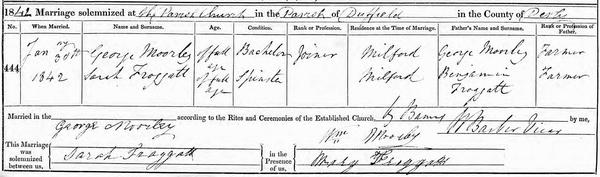 Of the Children of Benjamin and Sarah FROGGATT Henry FROGGATT was baptised at Barlborough on 12 Sept 1819. He died in October 1840 aged 21 and was buried at Twyford Derbyshire on 19 October. Sarah FROGGATT was baptised at Radbourne St Andrew on 15 April 1821. In the 1841 census she was aged 19 and living with her parents at Twyford. Sarah married George MOORLEY at Duffield St Alkmund on 30 Jan 1842. George was a farm bailiff, born in 1814 at Aston on Trent to George and Mary MOORLEY.