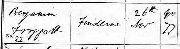 Census recordsBenjamin and Sarah appear in the eary census records. Death of Benjamin FROGGATTBy 1851 Benjamin was a pauper living at Findern village and by 1861 he was recorded as being blind. He died at Findern in November 1862 aged 77 and was buried at Twyford on 26 November 1862.