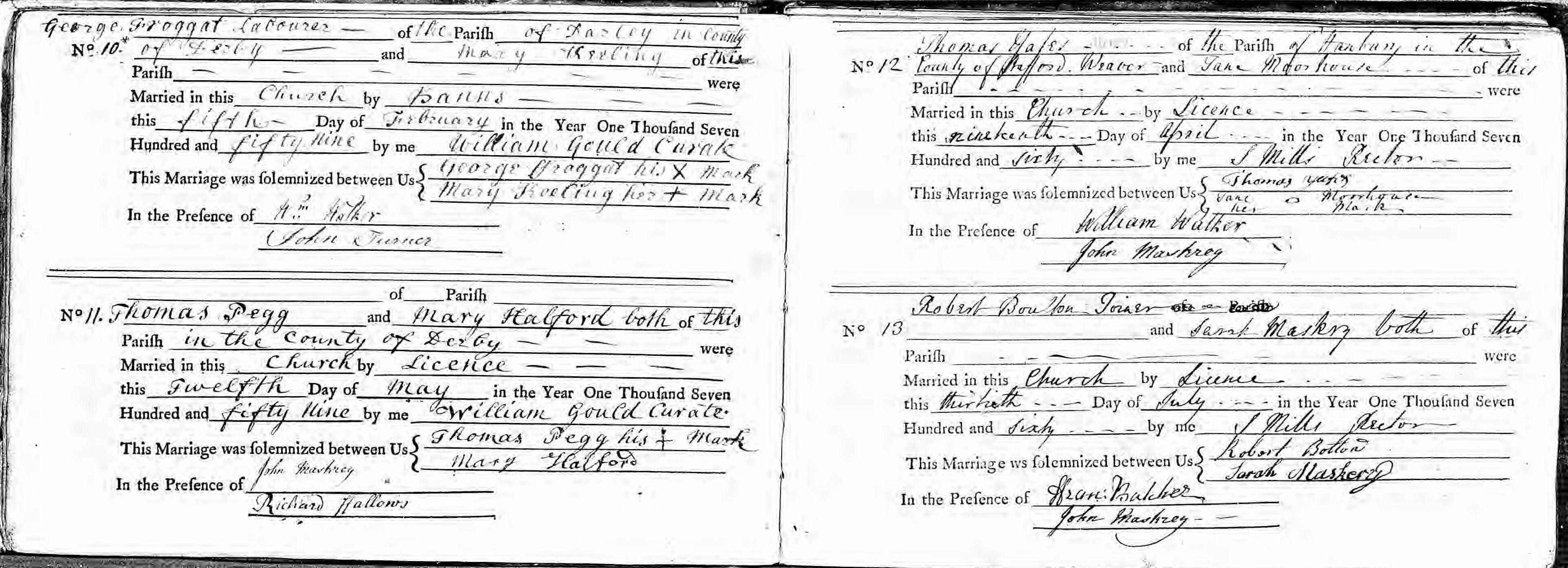 George FROGGATT (1731 - ?)George was born at Clifton and baptised at Ashbourne St Oswald on 9 May 1731. There is some confusion around who George married as there are two potential marriages, in 1757 and 1759. Most family trees have assumed the two marriages are for the same George and (presumably) his first wife had died shortly after marriage.The confusion is increased by the information provided on the LDS FamilySearch site - George was aged 21, widowed and a breeches maker, none of which is shown in the parish register (presumably added by the well-meaning transcriber for some reason). As there are no known children for George and his first wife it probably doesn't matter if we assume both marriages are for the same George. Thus George first married Ann WIBBERLEY at Ashbourne on 9 September 1757 and then Mary KEELING at Norbury on 5 February 1759. It is not clear what happened to Ann between 1757 and 1759, as there is no obvious burial record for her. The 1759 marriage shows George was living at Darley Dale at the time but the marriage was in Norbury where Mary lived. George and Mary appear to have had only two children - Ellen in 1760 and Edward in 1763, both baptised at Norbury.