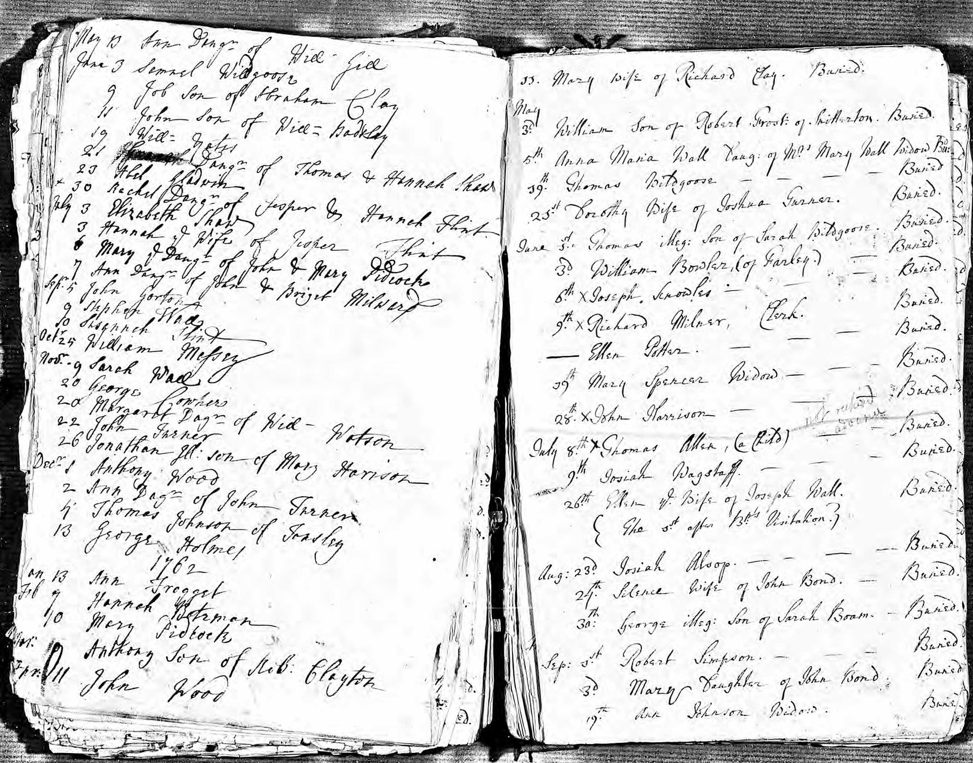 John FROGGATT (1732 - ?)John was born at Clifton and baptised at Ashbourne St Oswald on 4 April 1732. The handwriting in the register is difficult to read but by comparison to other names this indeed reads FROGOT. It would appear that John went to live at Darley where he married Ann HARRISON on 8 January 1755. Ann had been born to John HARRISON and Elizabeth (REINS) and baptised at Darley on 6 January 1726. Ann FROGGATT died at Darley in early 1762 and was buried at Darley St Helen on 13 January, the same day her son Samuel was baptised. John appears to have remained in Darley with the four children. He did not remarry. John died at Darley in August 1791 and was buried at Darley St Helen on 12 August. The register entry is a little confused as the rector had begun to write the name of a different person. Apparently John was a pauper