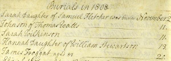 A Dorothy FROGGATT married William ELLABY at Ashbourne St Oswald on 6 July 1762. One Dorothy would have been aged 29 and the other was 33. Assuming one of these Dorothy's married William ELLABY, if we look for her death we find Dorothy ELLABy was buried at Ashbourne St Oswald on 6 May 1819. She was recorded as aged 89 so was born in 1729 - so she was the daughter of John and Sarah. After the birth of John, Dorothy seems to vanish from the records. There does not appear to be a marriage for her, or a burial. John however, appears to have remained at Norbury. It is likely that he married Margaret HILL at Norbury St Mary on 25 November 1789. They had two children baptised at Norbury (Ann 1791 and John 1793) before they also vanish from the records. Ann FROGGATT (1735 - 1735)There does not appear to be a baptism for Ann. We only know about her from the burial at Ashbourne on 29 September 1735 - "Ann daughtrer of William FROGGATT, Clifton". This suggest she died on the day of birth.