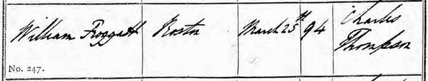 Baptism for William FROGGATT son of William FROGGATT of Clifton at Ashbourne St Oswald, Derbyshire. |