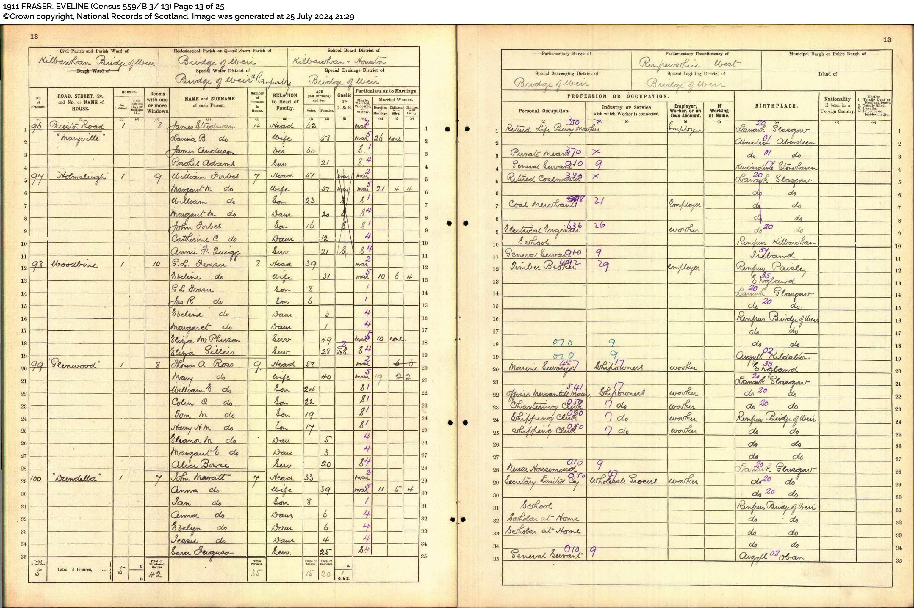 By the time of the 1911 census George and Eveline were living at "Woodbine", Bridge of Weir, Scotland where George was still working as a Timber Broker. By this date two sons - Charles Ward and ian Bernand - had died. The Electoral Registers also tell us that he owned 61 and 63 Trefoil Ave, Glasgow by this date.