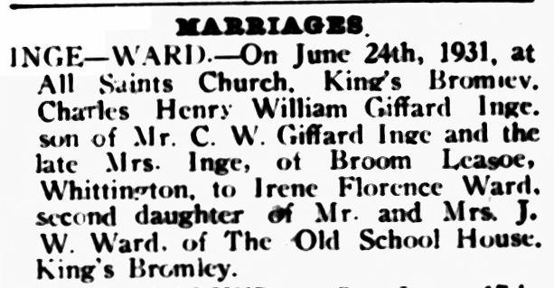 Irene Florence WARD (1905-1992) was born in Leicester on 18 September 1905 to Joseph and Florence WARD. She was recorded with her parents in the 1911 and 1921 censuses. Irene married Charles Henry William Gifford INGE at All Saints Church, King's Bromley on 24 June 1931. Charles INGE was a surveyor and estate agent, as was his father. They lived at Broom Leasoe Cottage, beside the Coventry Canal at Whittington.