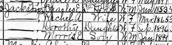 ![]() 1910 US census for Charles JACKSON at 868 East 2nd South, Salt Lake City. This record is unusual as it records Charles' deceased wife Rachel. |