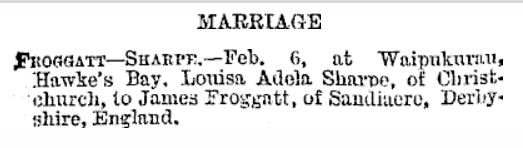 The Children of Sarah and William FROGGATTWilliam FROGGATT (1869-1946)William was born 10 January 1869 at Sandiacre, the first child of William and Sarah. He grew up in Sandiacre, was well educated, including having a private tutor - William Whitehead - and a time at the nearby Risley Latin School. But William struggled after his father died in 1881. He was caught throwing sticks into the chestnut trees of a local landowner, and was reputed to have cut the head off a topiary rooster. When he was just 16 years old he was on a ship bound for Australia where he could start a new life. It is unknown whether he chose to go or was coerced or whether his fare was paid out of his future inheritance, but he was followed a year later by his brother James, suggesting both chose to go. William had an interesting life in the colonies (Australia and New Zealand) married twice and had 14 children. There is more about the life of William Froggatt (my grandfather) here.James FROGGATT (1870-1905)James was born early 1870 at Sandiacre. He does not appear to have been baptised, either in the Baptist, Methodist or CofE churches. When he was 16 years old he too boarded a ship for Australia, arriving in Melbourne in May 1887. He appears to have found a job with the railways but soon left and moved to Christchurch, New Zealand, where he again joined the railways. Here he met Louisa Adele SHARPE. When James was posted to the small town of Waipukurau in Hawkes Bay, He was joined there by Louisa and they married on 6 February 1894 at the local St Mary's Church. James and Louisa returned to Christchurch, but James had contracted tuberculosis (he may well have been infected in England before he left) and he died in Christchurch on 28 July 1905. He is buried at Linwood Cemetery, along with his wife Louisa and mother-in-law Elizabeth SHARPE (née MARSDEN). James and Louisa did not have any children. In 1897 James had made a Will, leaving his entire estate to his wife Louisa. This included the proceeds of two life insurance policies.