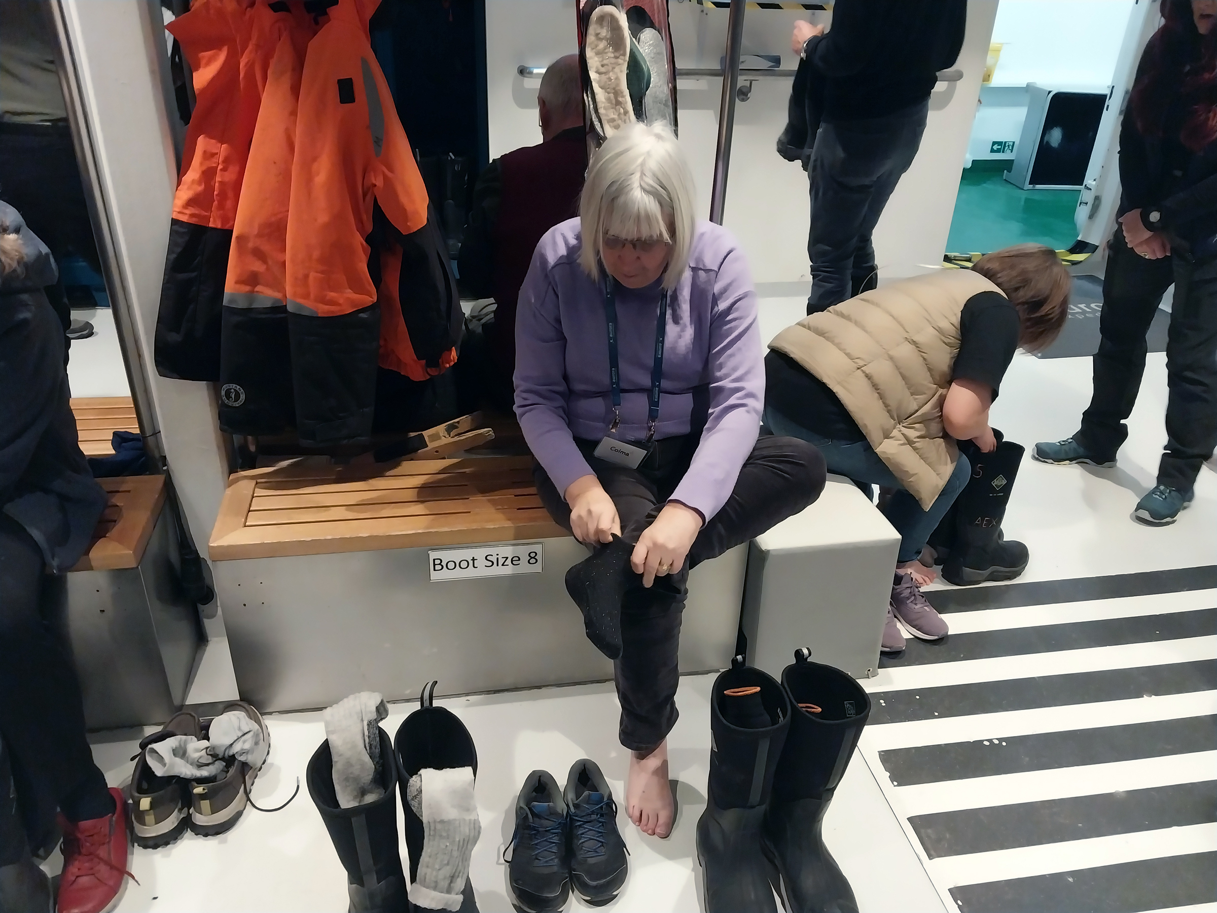 that our new coats fitted and we were introduced to the "mud-room" where our muck boots and life vests awaited and where we checked everything fitted. Of course most people had
